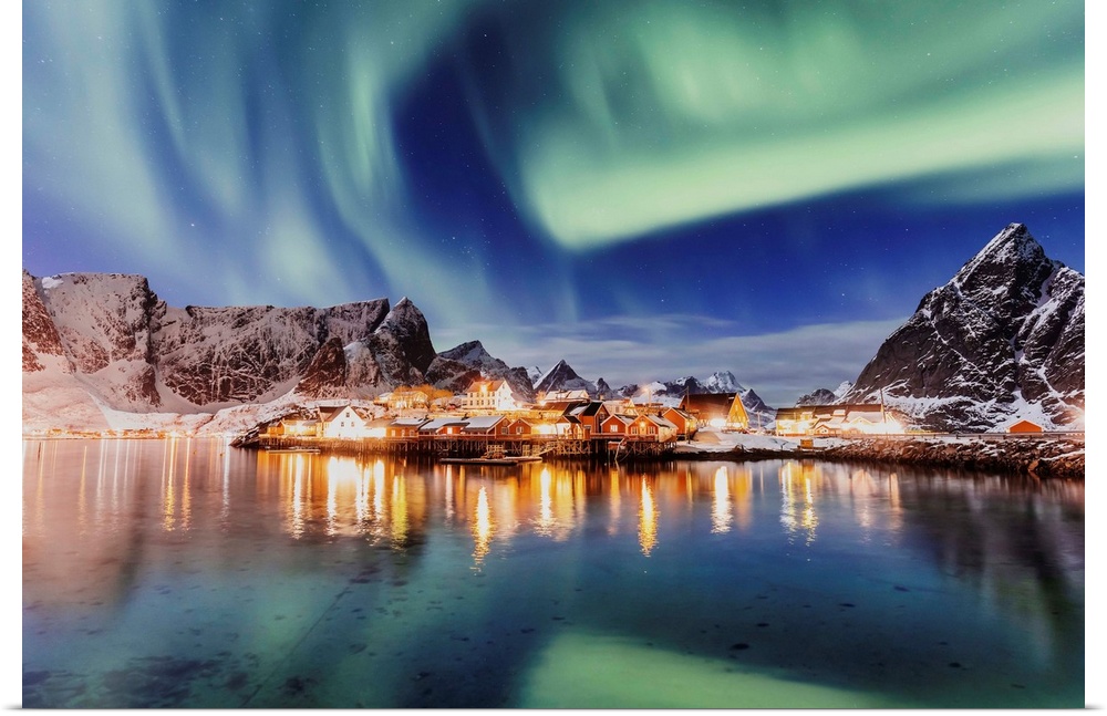 <p>Norway, Nordland, Lofoten Islands, Scandinavia, Moskenesoya, The northern lights in the sky above Sakrisoy village in Lofoten islands on a winter night with the mountains covered with snow</p>