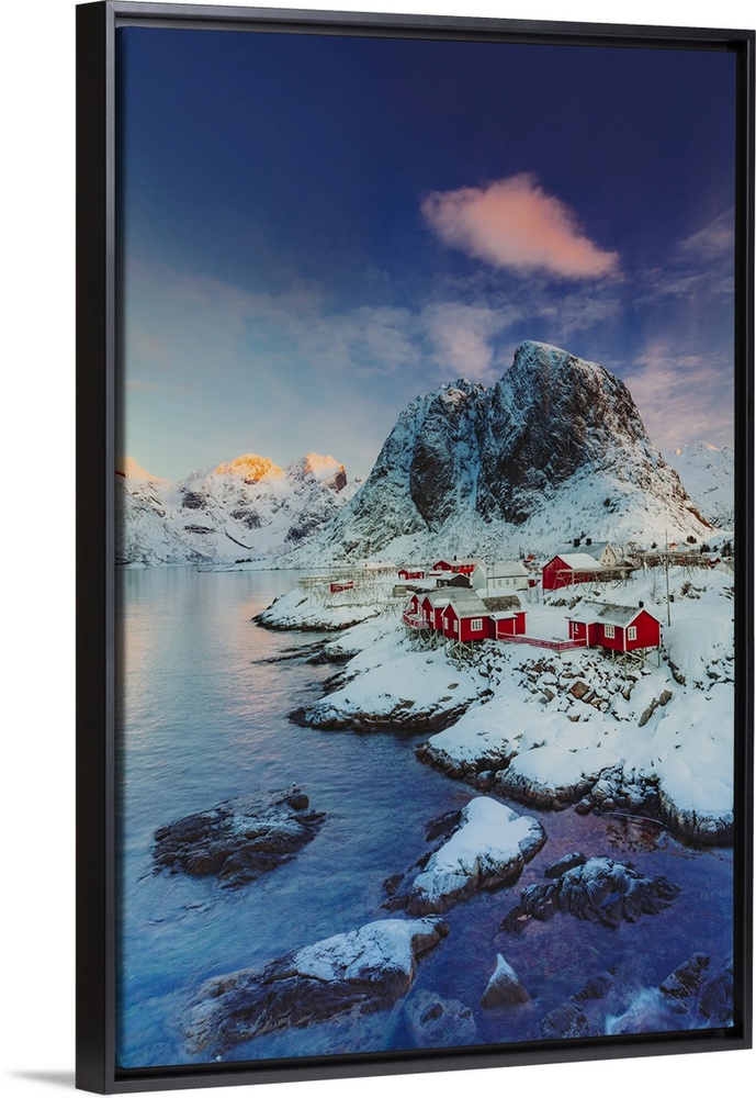 <p>Norway, Nordland, Lofoten Islands, Moskenesoya, Scandinavia, Sun rising on the little village of Hamnoy near Reine, one of the most beautiful of Lofoten Islands</p>