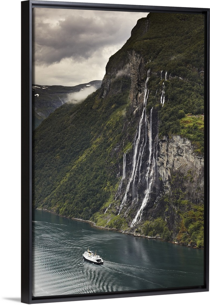<p>Norway, More og Romsdal, Scandinavia, Geirangerfjord, Geiranger, Passenger ferry on the Geirangerfjord at the Seven Sisters Waterfall.</p>