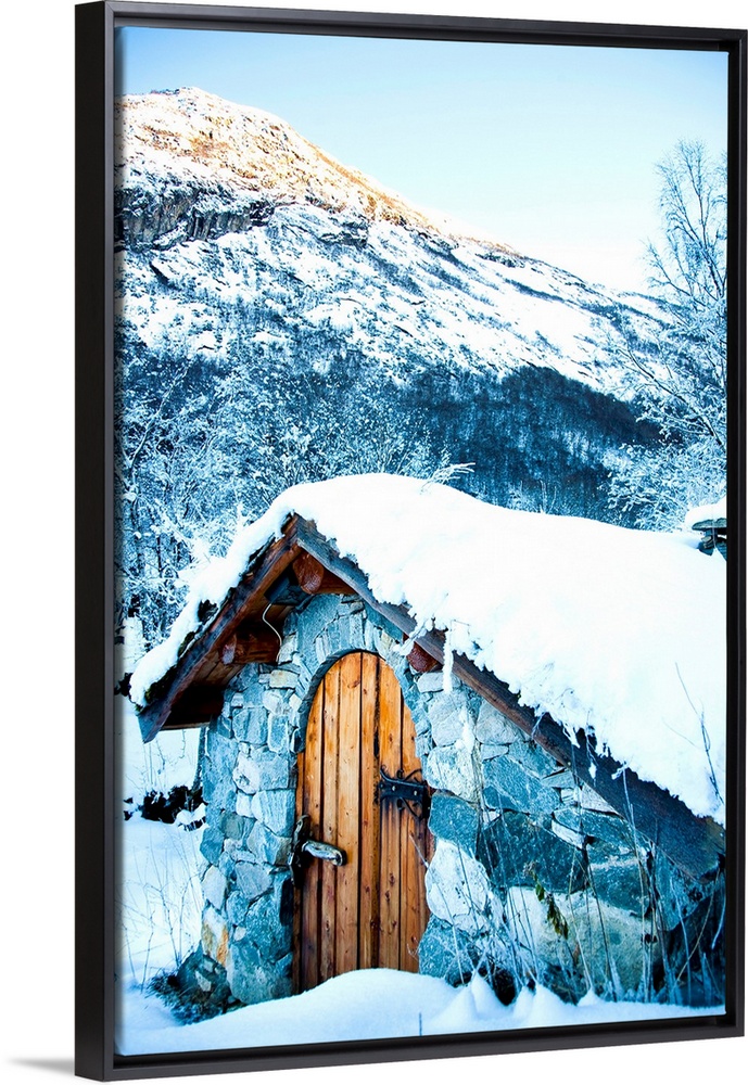 <p>Norway, Sognefjord, snow covered traditional stone building which houses hydro electric generator; Ortnevik, Snowy alpine scenery</p>