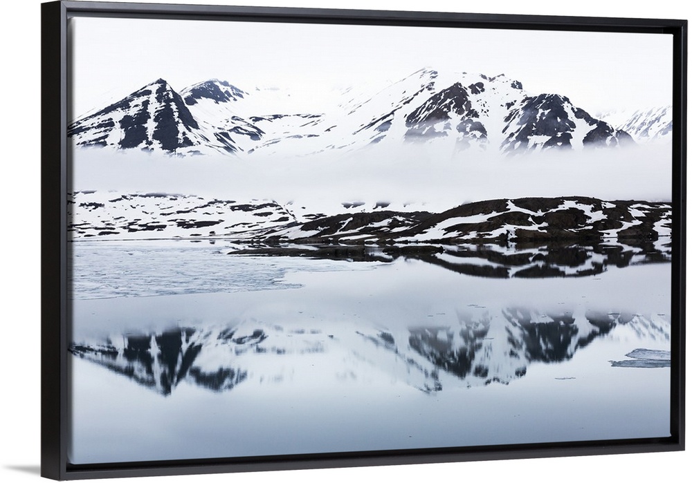 <p>Norway, Svalbard, Monacobreen glacier, Reflections of mountains and glacier.</p>
