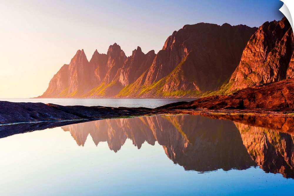 <p>Norway, Troms, Scandinavia, Senja island, Sazza, Wild peaks at Ersfjorden at sunset.</p>
