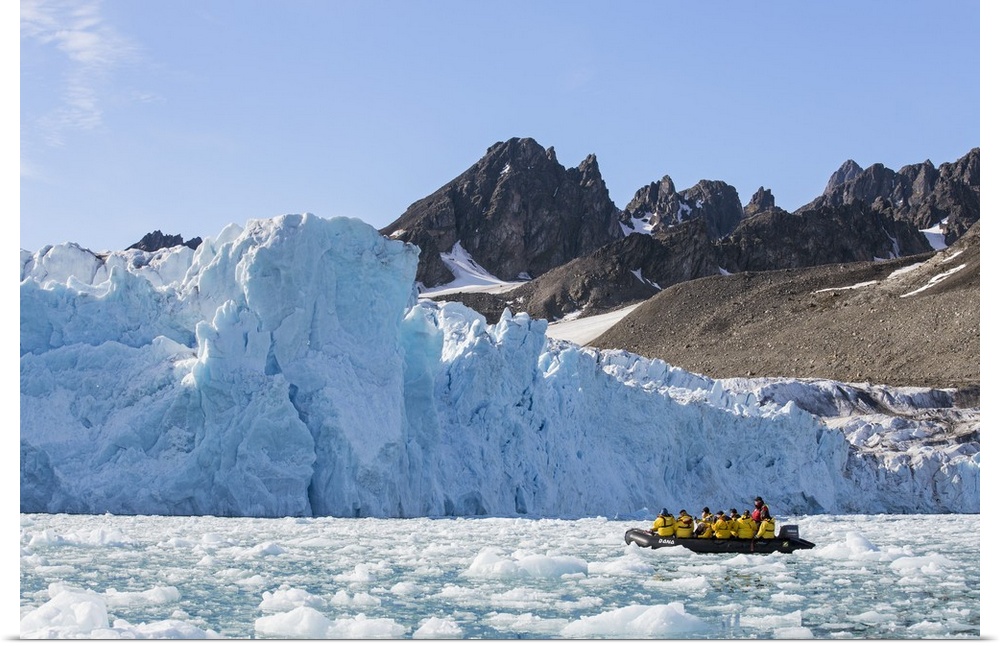 <p>Norway, Arctic, Svalbard, Spitzbergen, Liefdefjorden. Visitors in a zodiac forge a way through brash ice towards the spectacular Monaco Glacier.</p>