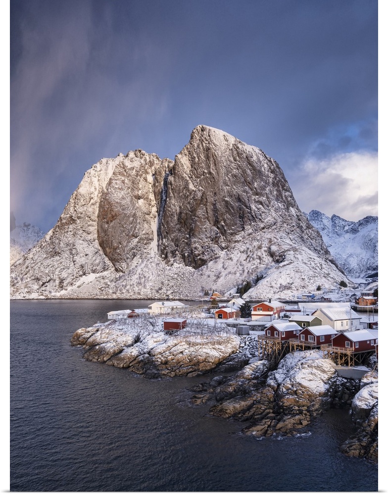 <p>Red Norwegian Rorbuer Huts and Festhaeltinden mountain in winter, Hamnoy, Moskenes Municipality, Nordland County, Lofoten Islands, Norway, Scandinavia, Europe</p>