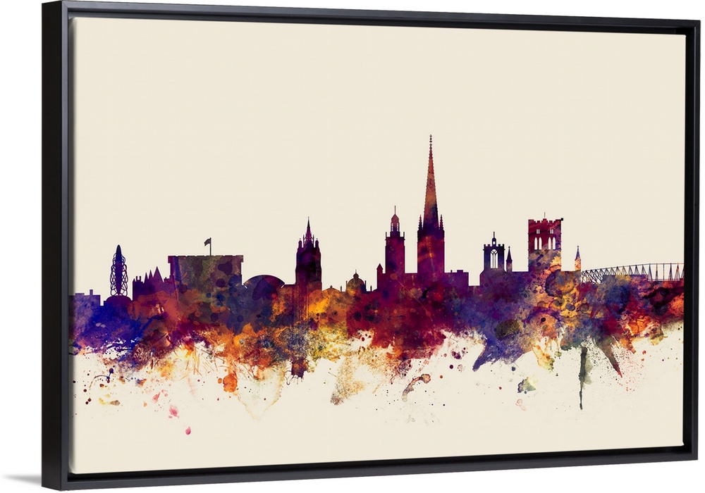 <p>Dark watercolor splattered silhouette of the Norwich city skyline.</p>