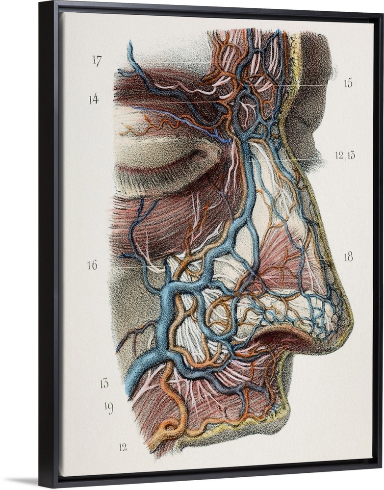 <p>Nose nerves and vessels. This anatomical artwork is figure 7, plate 84 from volume 3 (1844) of 'Traite complet de l'anatomie de l'homme' (1831-1854). This 8-volume anatomy atlas was produced by the French physician and anatomist Jean-Baptiste Marc Bourgery (1797-1849). The illustrations were by Nicolas-Henri Jacob (1781-1871).</p>