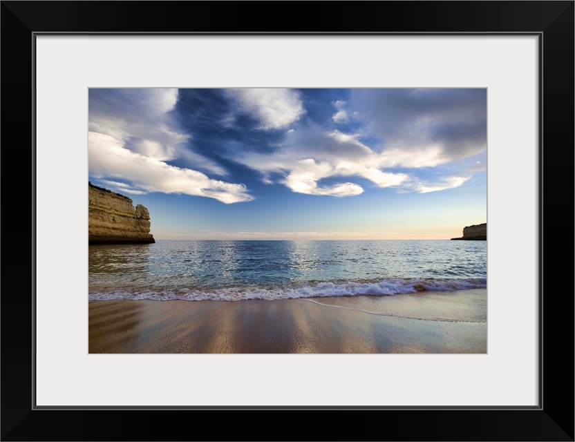 <p>A beautiful picture taken while standing on a beach and looking out at the vast ocean. Cliffs line both sides of the picture and immense clouds hang in the sky.</p>