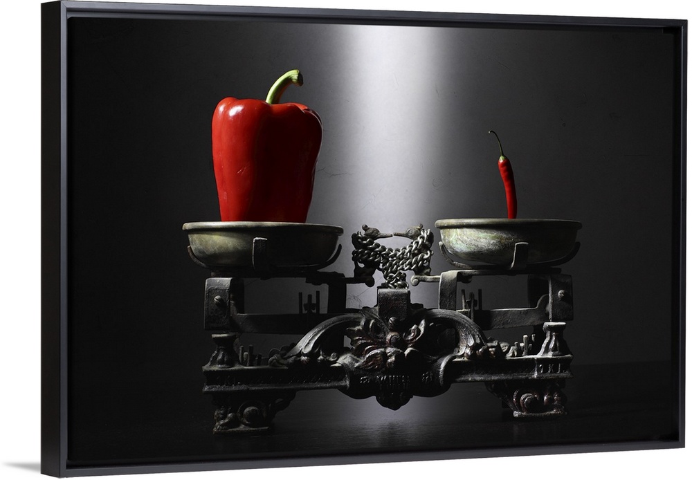 <p>A large bell pepper and a smaller chili pepper being weighed on a scale.</p>
