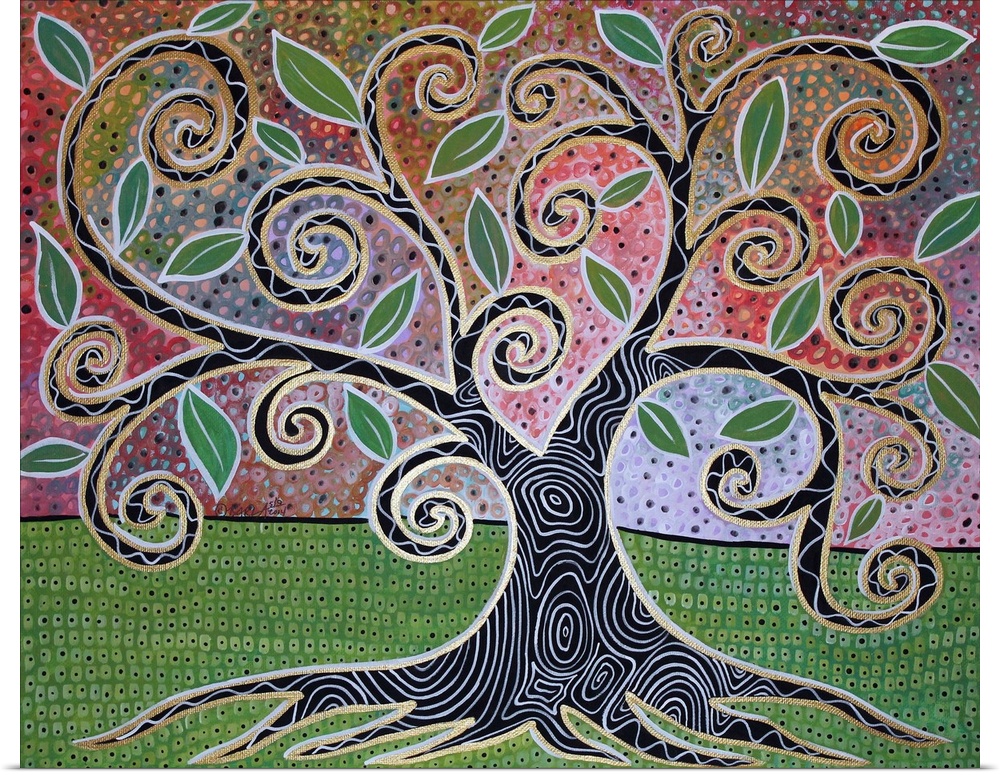 <p>Contemporary painting of a tree with swirling branches and broad leaves, with a patterned trunk.</p>