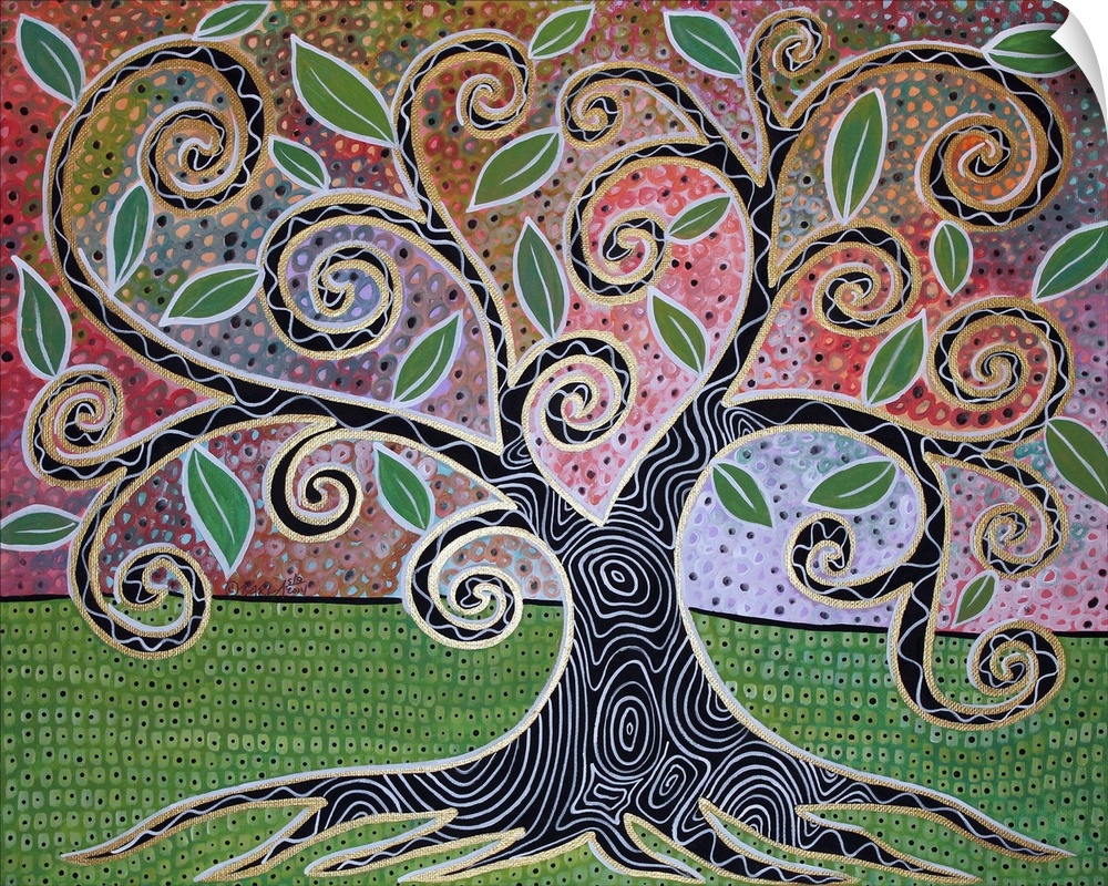 <p>Contemporary painting of a tree with swirling branches and broad leaves, with a patterned trunk.</p>