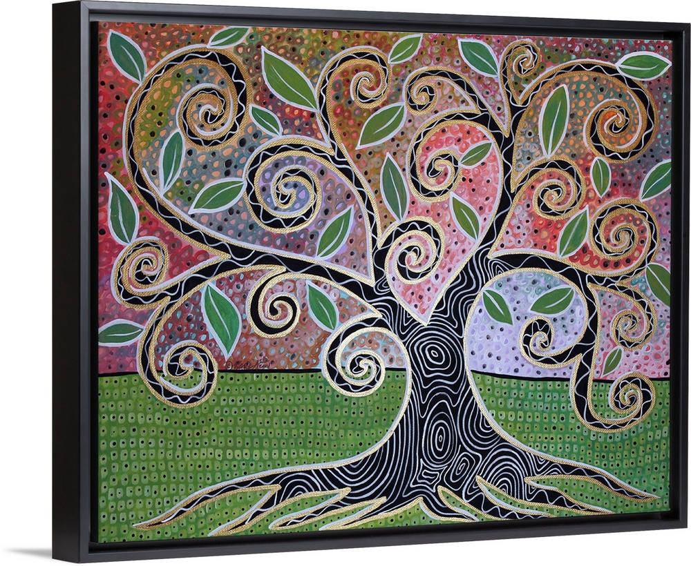 <p>Contemporary painting of a tree with swirling branches and broad leaves, with a patterned trunk.</p>