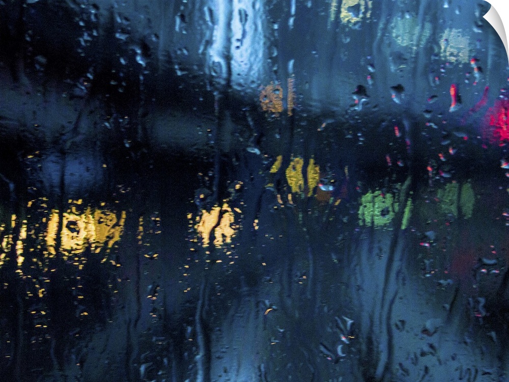 <p>A rain strreaked window with blurred city lights.</p>