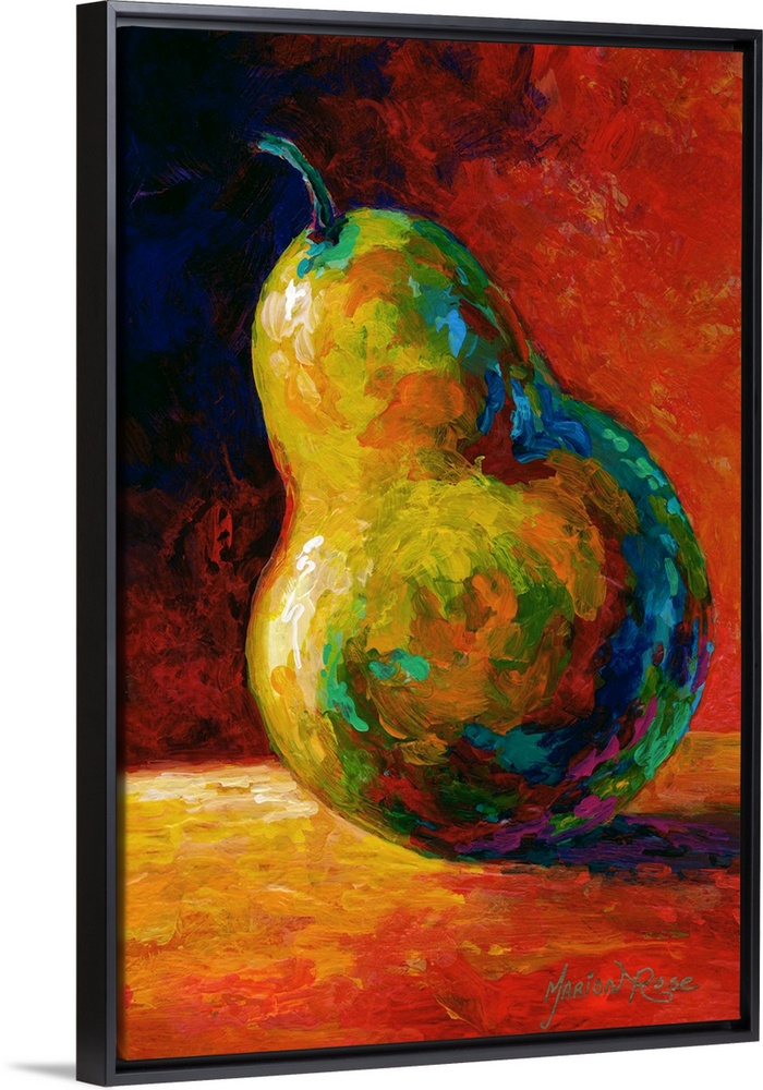 <p>Contemporary artwork of a single pear resting on a table and casting a shadow, done in bold colors.</p>