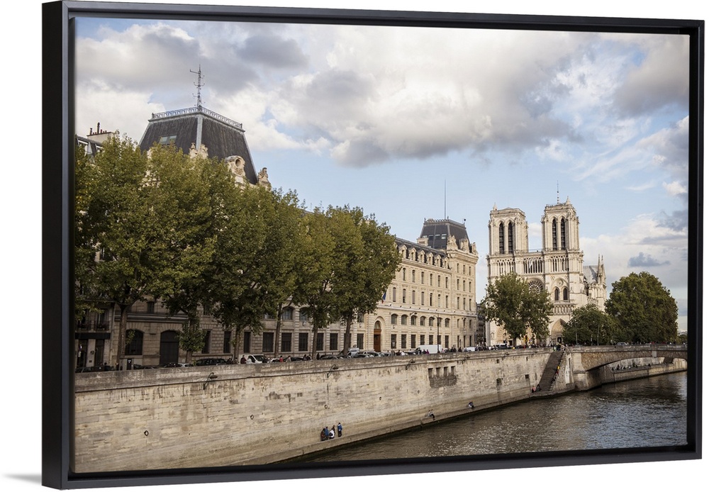 <p>Photograph of the Notre Dame gothic architecture from the water.</p>