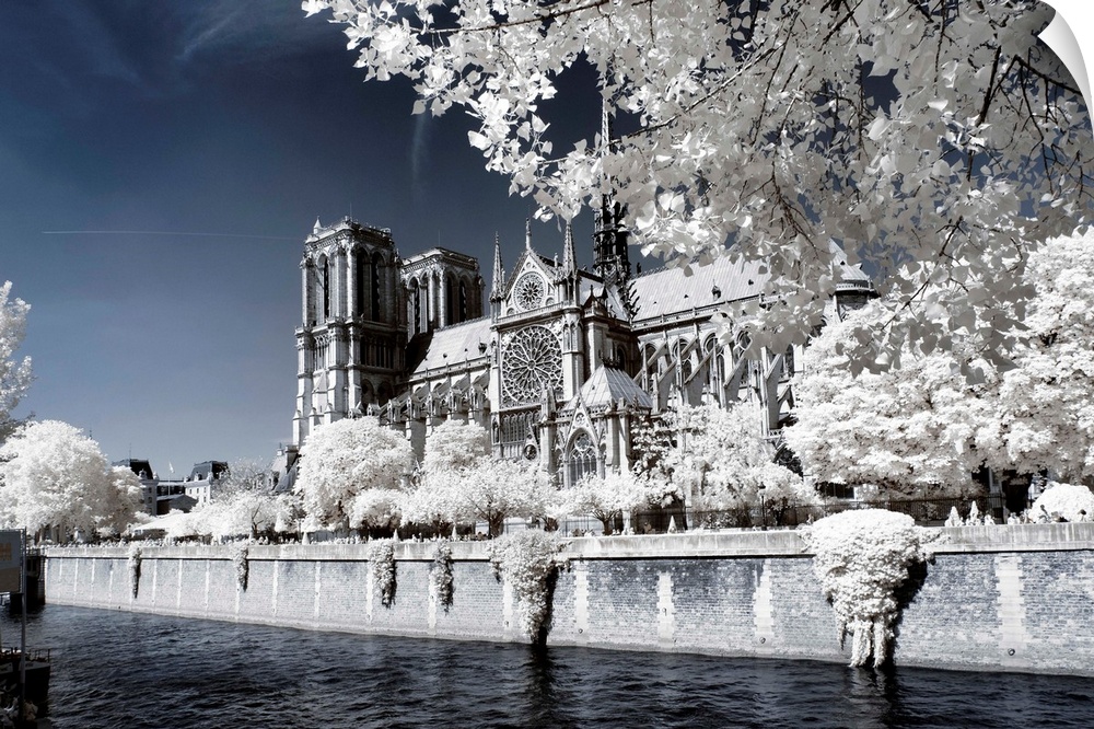 <p>A view of the Notre Dame Cathedral in Paris, made in infrared mode in summer. The vegetation is white and rendering of the sky is deep blue. From the "Another Look" series.</p>
