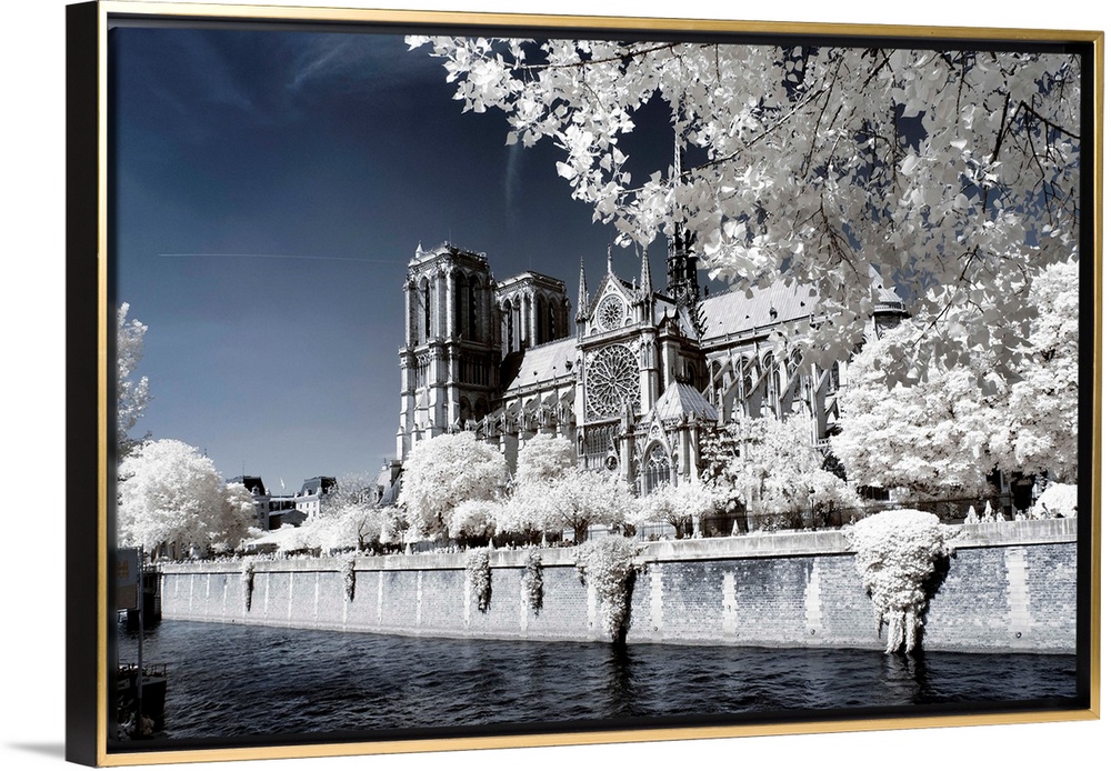 <p>A view of the Notre Dame Cathedral in Paris, made in infrared mode in summer. The vegetation is white and rendering of the sky is deep blue. From the "Another Look" series.</p>