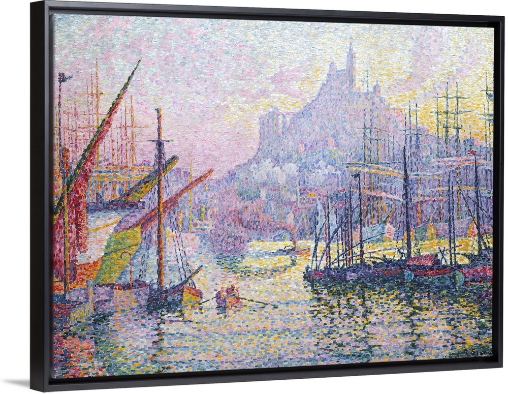 <p>After visiting Marseilles in late 1905, Signac proceeded to paint two canvases in his studio: one showing the entrance to the port and this view, facing the hill surmounted by Notre-Dame-de-la-Garde, the church nicknamed the Good Mother by seamen. Bright and boldly colored, the composition reflects Signac's contact with the artists Henri-Edmond Cross and Matisse at Saint-Tropez in the summer of 1904. The rectangular strokes of unmixed pigment, arranged like tesserae in a mosaic, are Signac's variation on the innovative painting method pioneered by Seurat.</p>