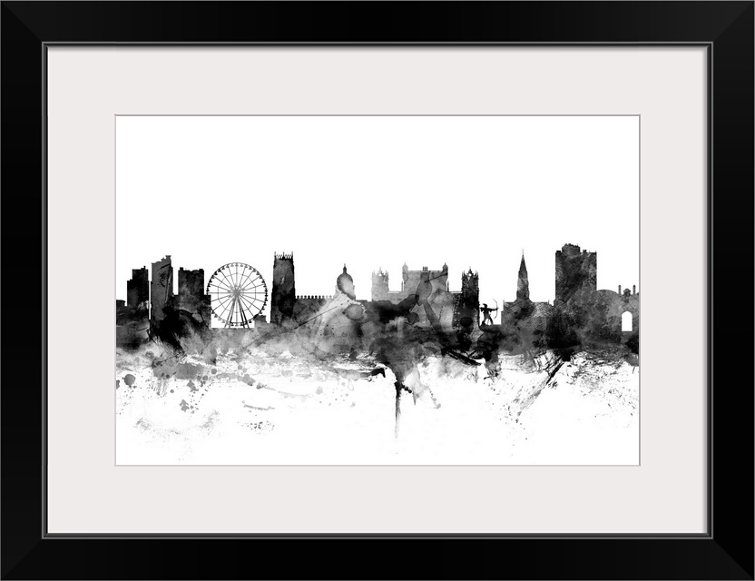 <p>Contemporary artwork of the Nottingham city skyline in black watercolor paint splashes.</p>