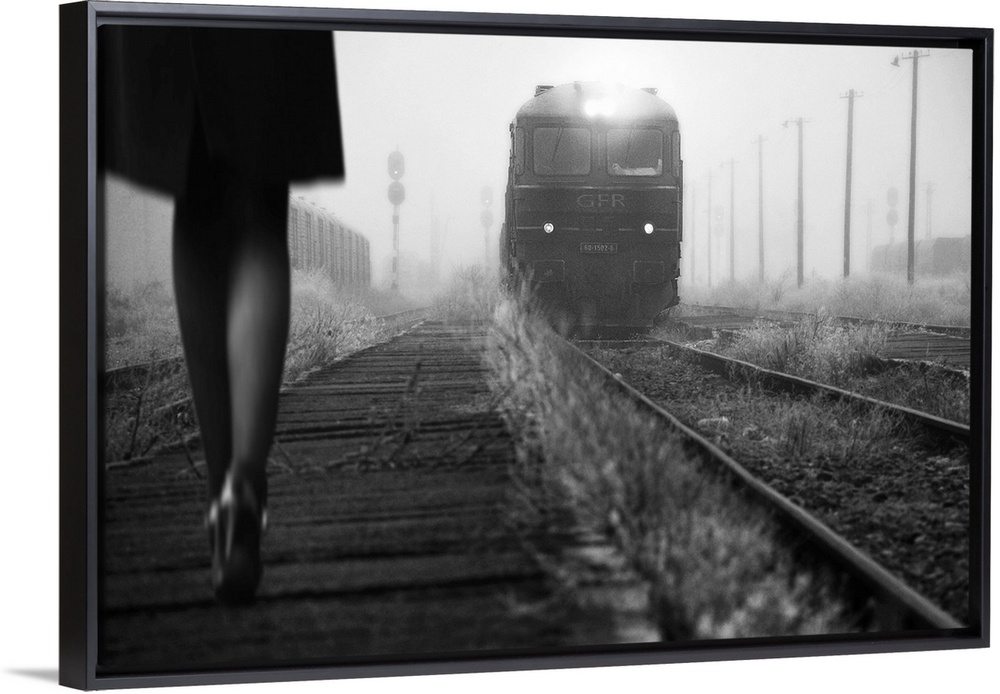<p>Black and white image of a woman in heels talking along a path by railroad tracks with an approaching train.</p>