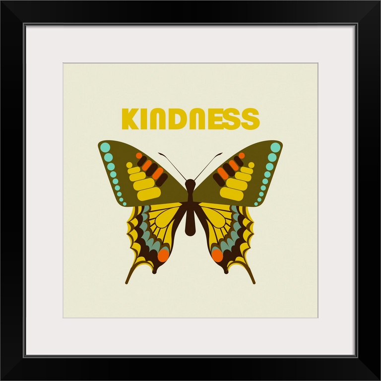 <p>A modern illustration of butterfly and the text 'Kindness' with a white border.</p>