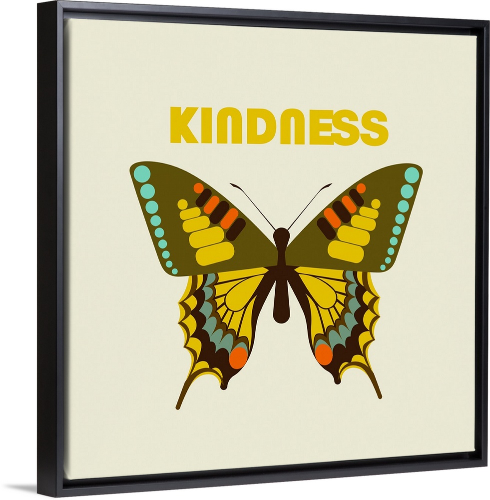 <p>A modern illustration of butterfly and the text 'Kindness' with a white border.</p>