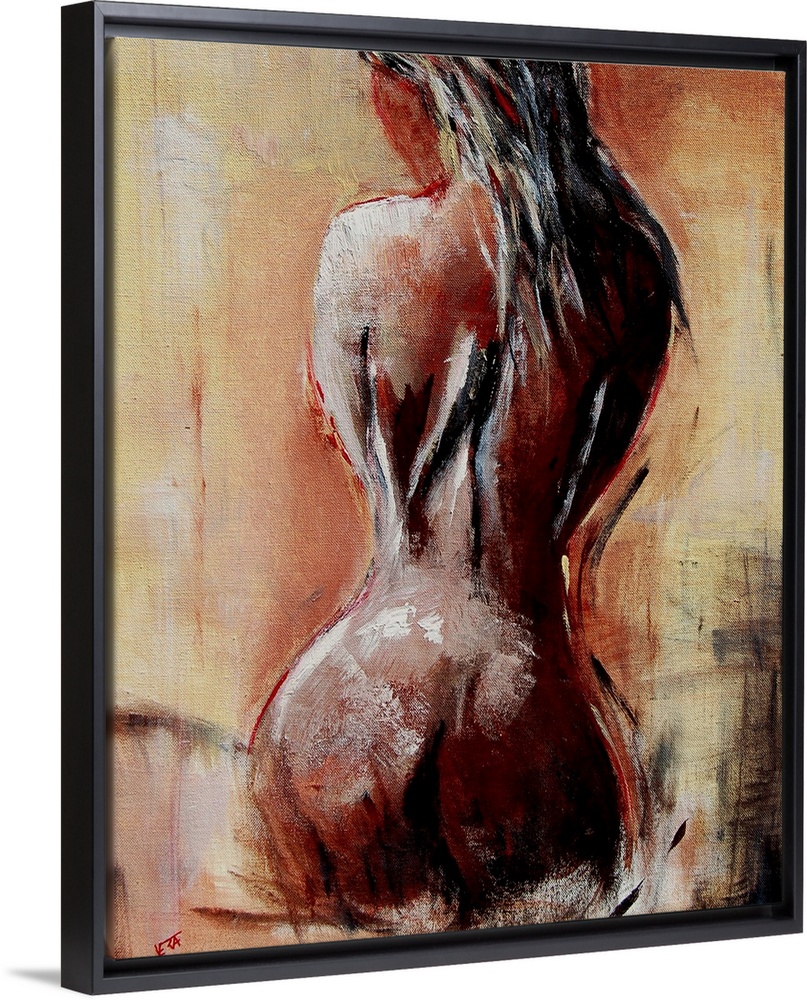 <p>A nude painting of the back of a woman sitting on her legs in textured neutral colors and red accents.</p>