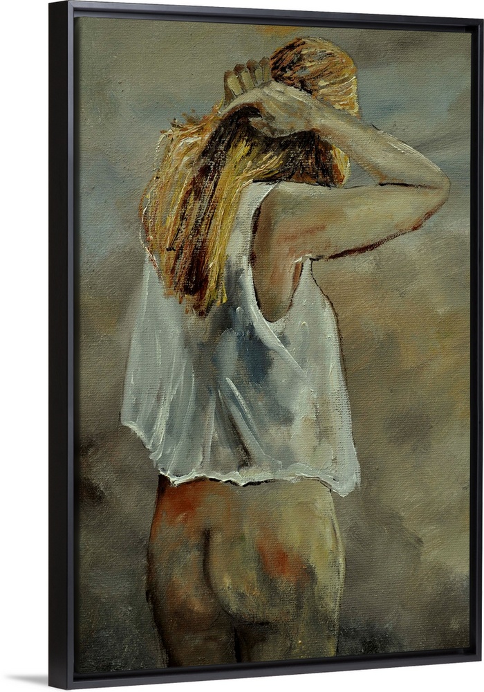 <p>A portrait of a woman wearing only a transparent shirt as she adjusts her hair, with her back towards the viewer.</p>