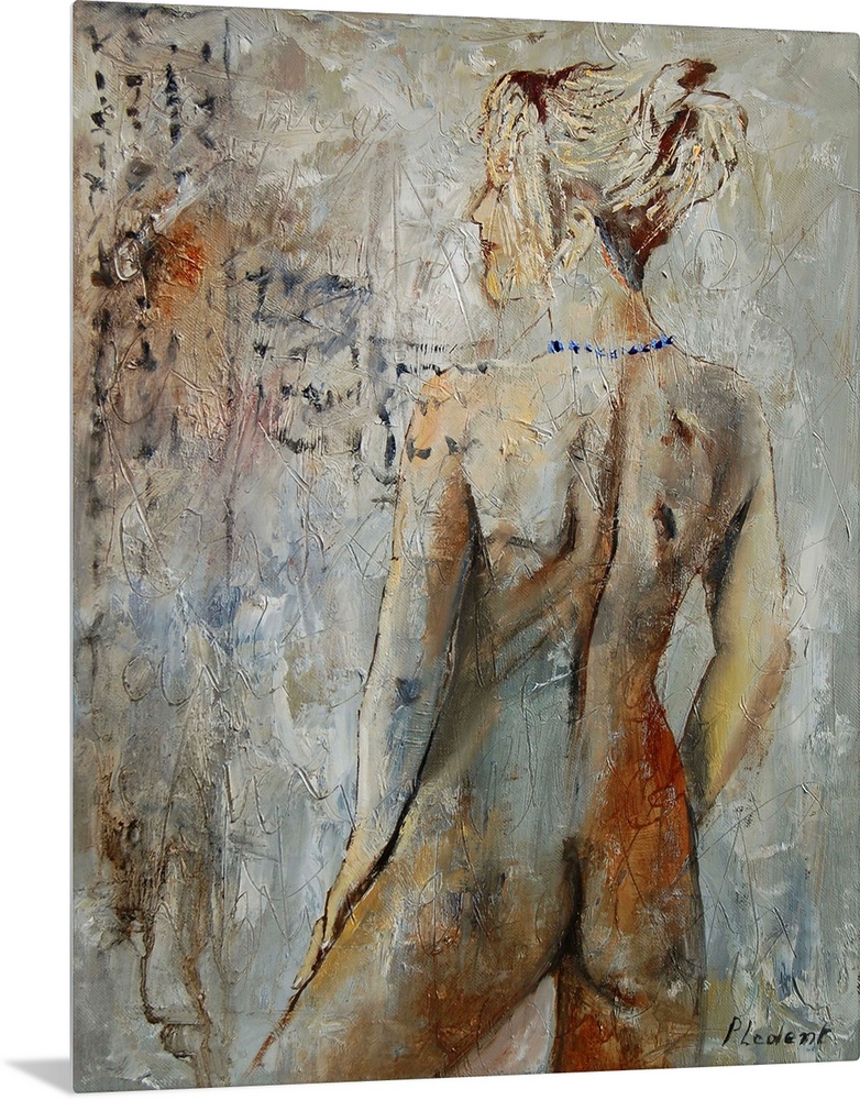 <p>A nude painting of the back of a woman as she looks over her shoulder in neutral shades of textured paint.</p>