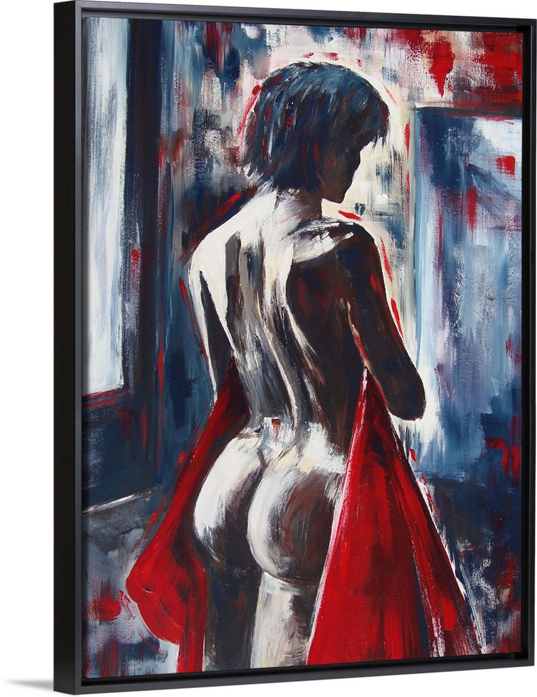 <p>A nude painting of the back of a woman holding a red cloth to her front.</p>