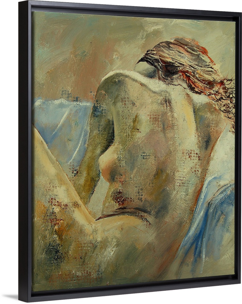 <p>A nude portrait of a woman sitting, facing away, painted in textured neutral colors with blue accents.</p>