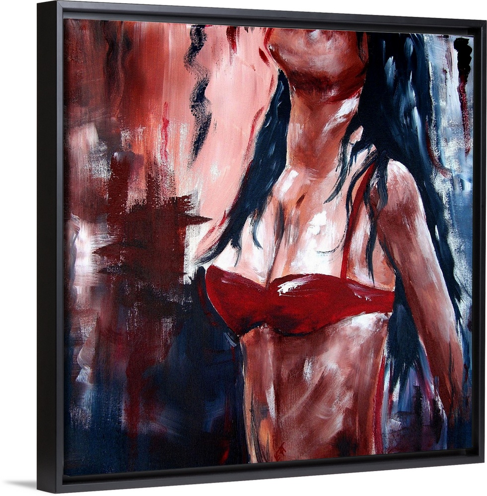 <p>A horizontal painting of the body of a woman from the neck down, wearing a red bikini.</p>