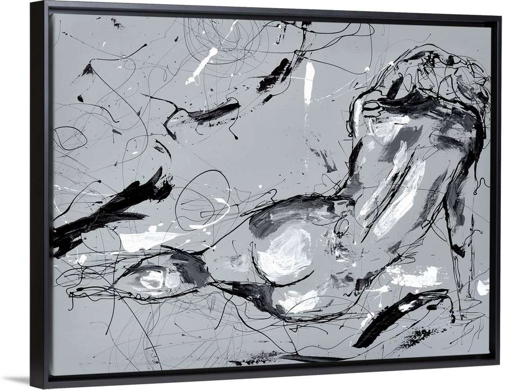 <p>Contemporary abstract painting of the backside of a nude woman created with black scribbled lines and white highlights on a grey background.</p>