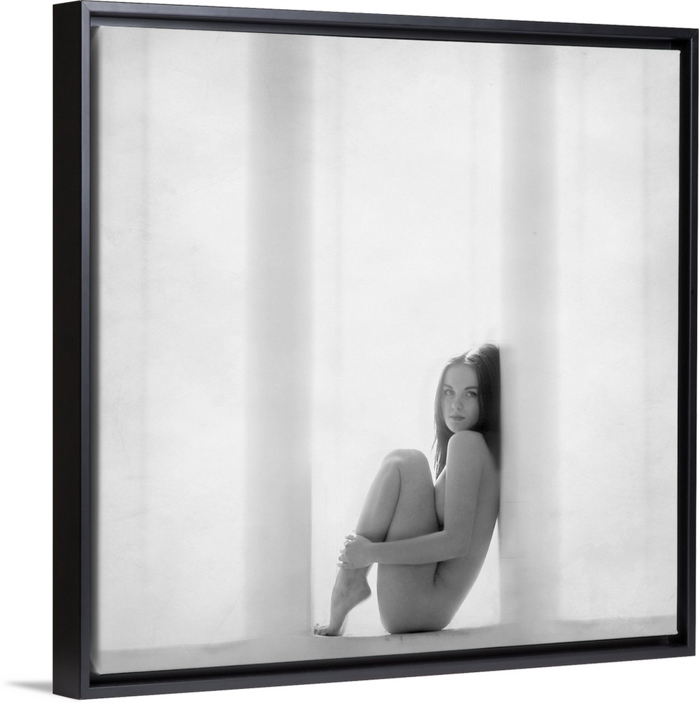 <p>Nude woman curled up in a window frame in black and white.</p>