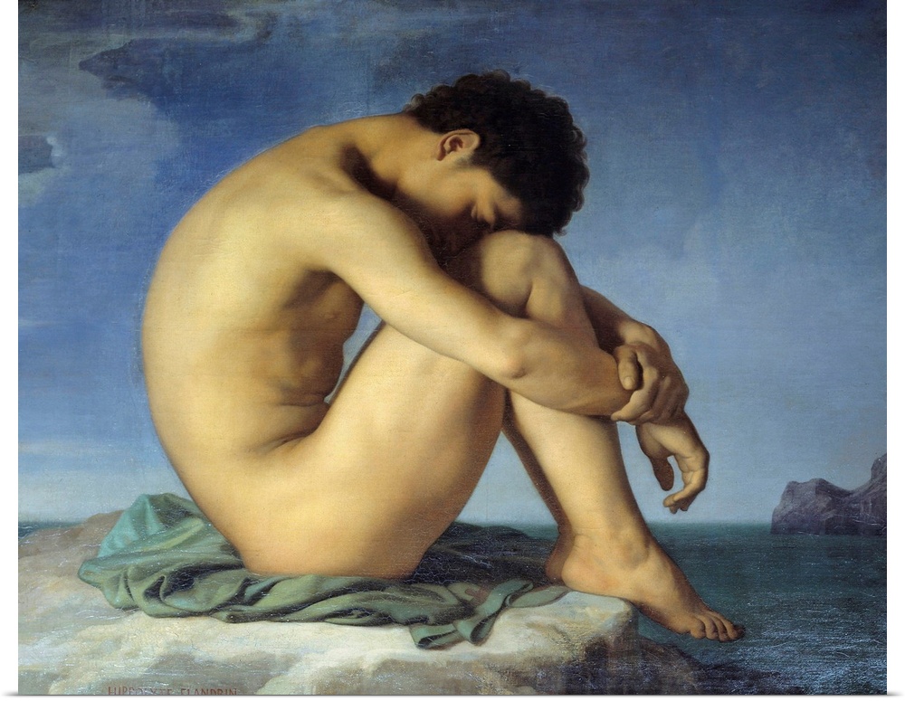 <p>Young naked man sitting on the edge of the sea. Thinker in a in a fetal, slumber position of protection and reflection. 1836. Oil on canvas painting by Hippolyte Flandrin (1809-1864), 1836. 0,98 x 1,24 m. Louvre Museum, Paris</p>