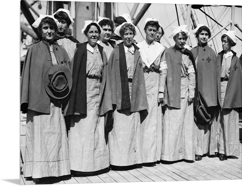 <p>Nurses on the deck of the 'Red Cross' bound for Europe at the start of World War I. Photograph, September 1914.</p>