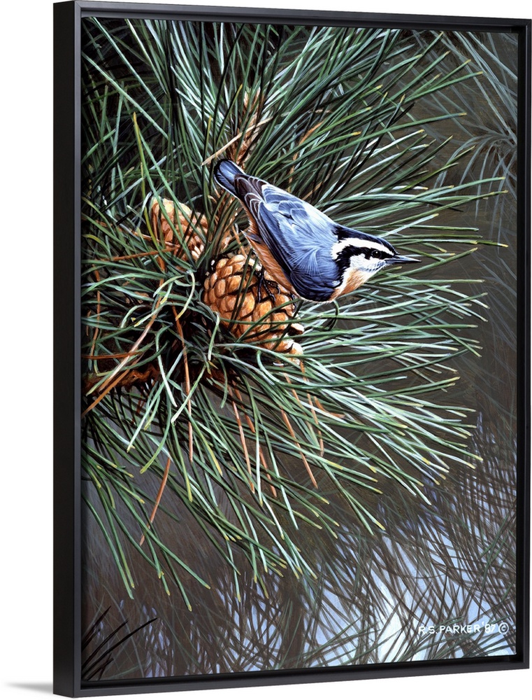 <p>A nuthatch on a pine cone in an evergreen tree.</p>