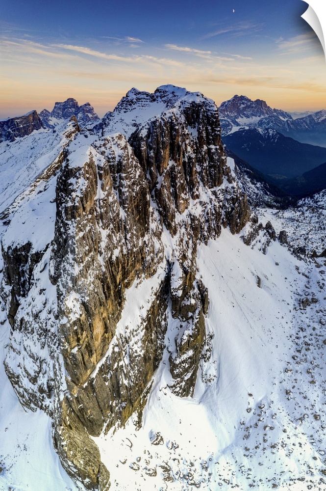 <p>Aerial panoramic of majestic Nuvolau, Monte Pelmo and Civetta covered with snow at sunset, Dolomites, Veneto, Italy, Europe</p>