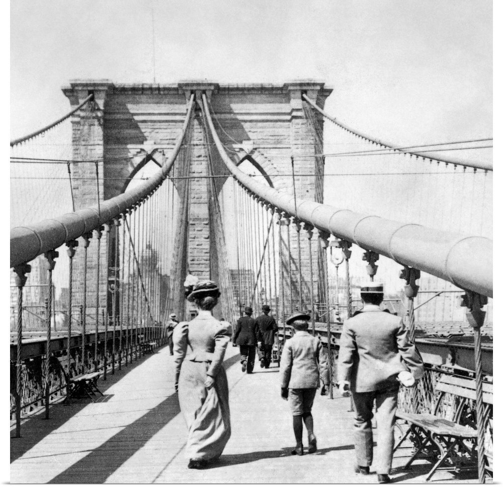 <p>On the pedestrian promenade of the Brooklyn Bridge. Photograph, from a stereograph view, c1899.</p>