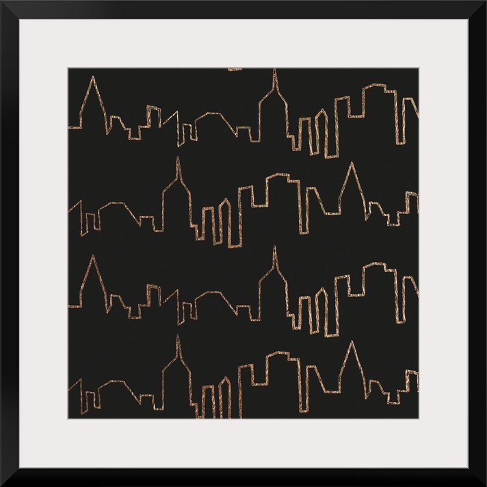 <p>A square design of rows made from outlines of skyscrapers in gold on a black background.</p>