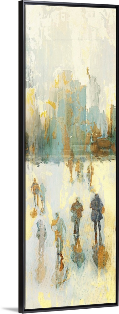 <p>Contemporary artwork of figures walking and casting shadows, with the New York skyline in the distance.</p>