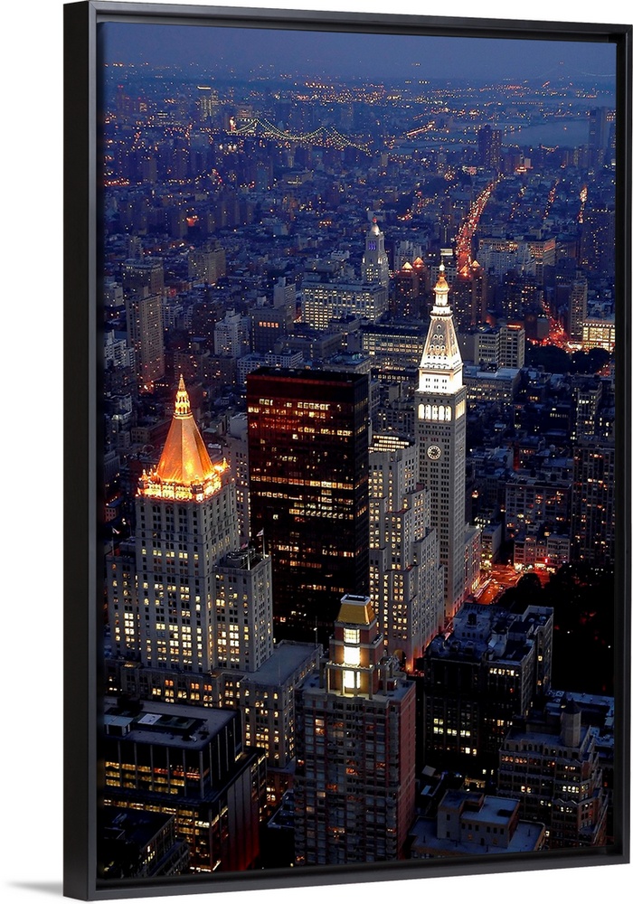 <p>This vertical artwork is an aerial photograph of a Manhattan skyscrapers illuminated in the evening.</p>