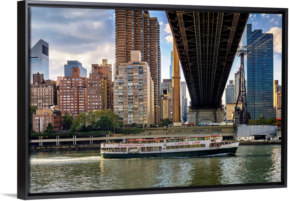 <p>New York, NYC, City skyline, Queensboro Bridge, cruise ship, viewed from Roosevelt Island.</p>