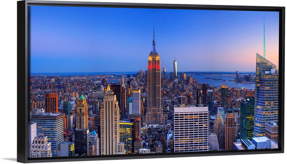 <p>New York, New York City, Manhattan, Empire State Building, Cityscape from Top of the Rock observation deck at the Rockefeller Center at night.</p>