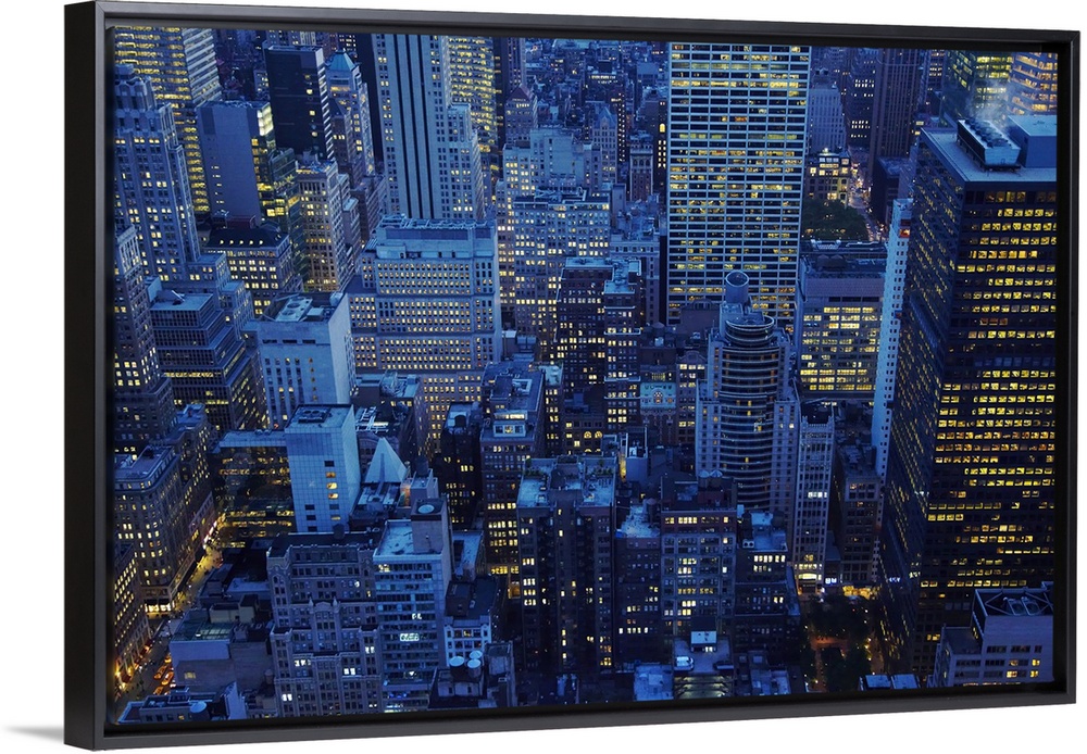 <p>This photograph is looking down from a skyscraper at smaller building lit up for the night.</p>
