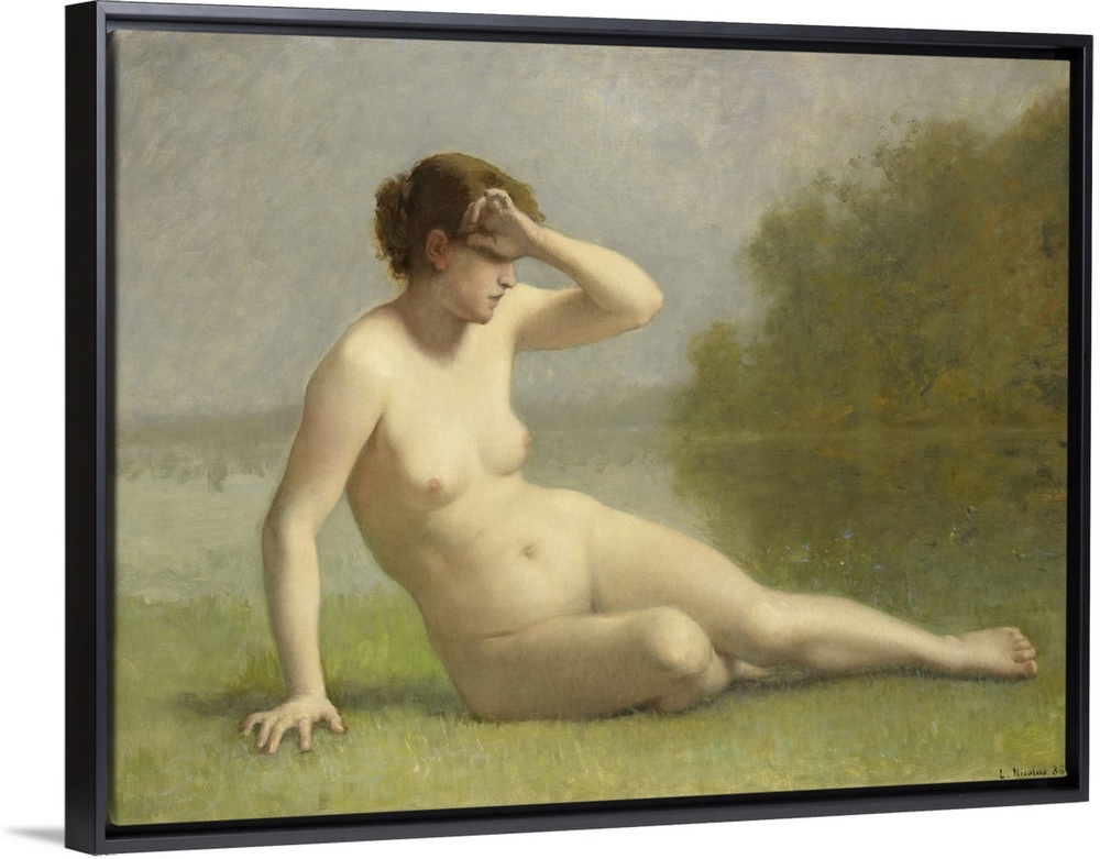 <p>Nymph, by L. Nicolas, 1886, Dutch painting, oil on canvas. A young naked woman sitting in the grass at the water's edge.</p>