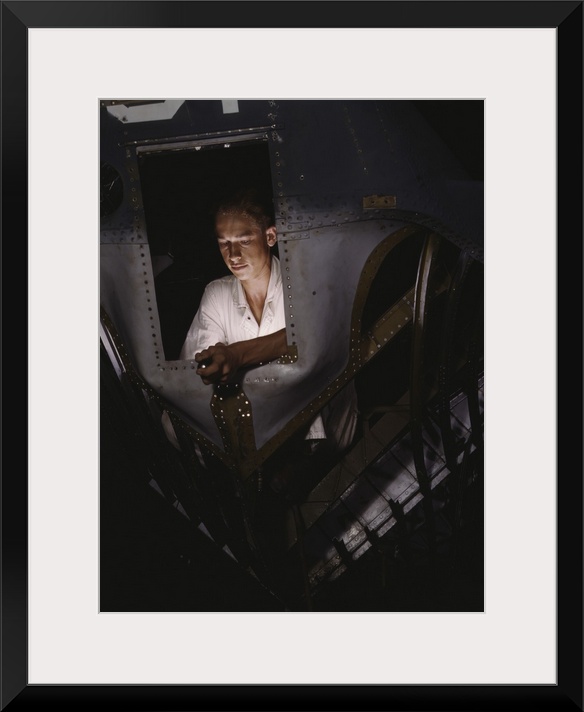 <p>August 1942 - A National Youth Administration trainee working inside the nose cone of a PBY Catalina Navy plane, Corpus Christi, Naval Air Base, Texas.</p>