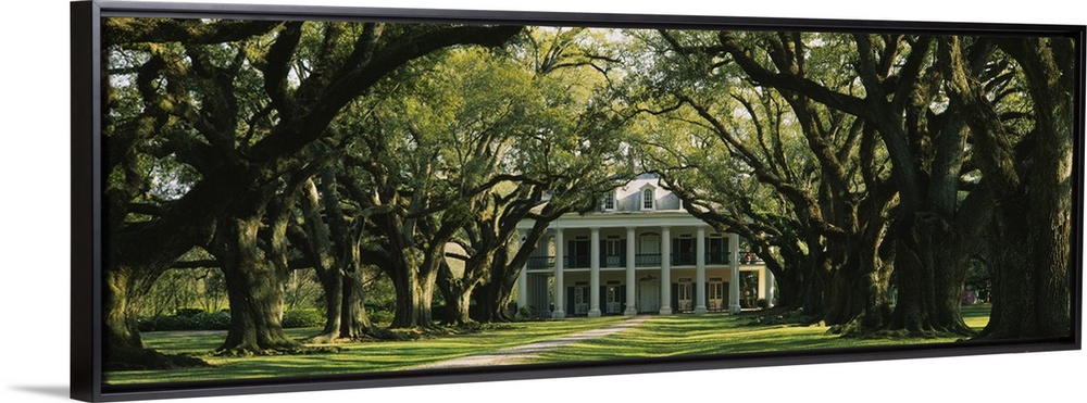 <p>Panoramic, oversized photograph of Oak Alley Plantation at the end of a pathway surrounded by large oak trees.</p>