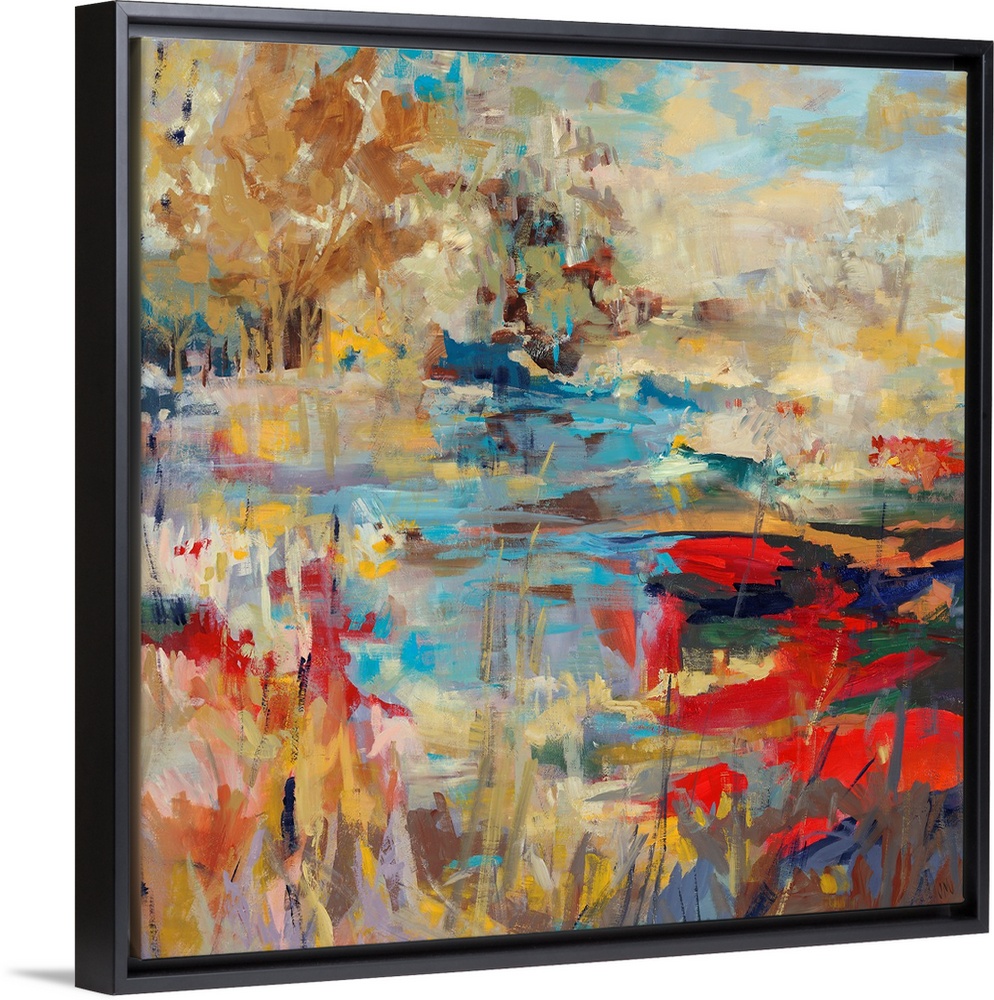 <p>Abstract landscape painting of a creek with hints of poppy red and bright, mustard yellows.</p>