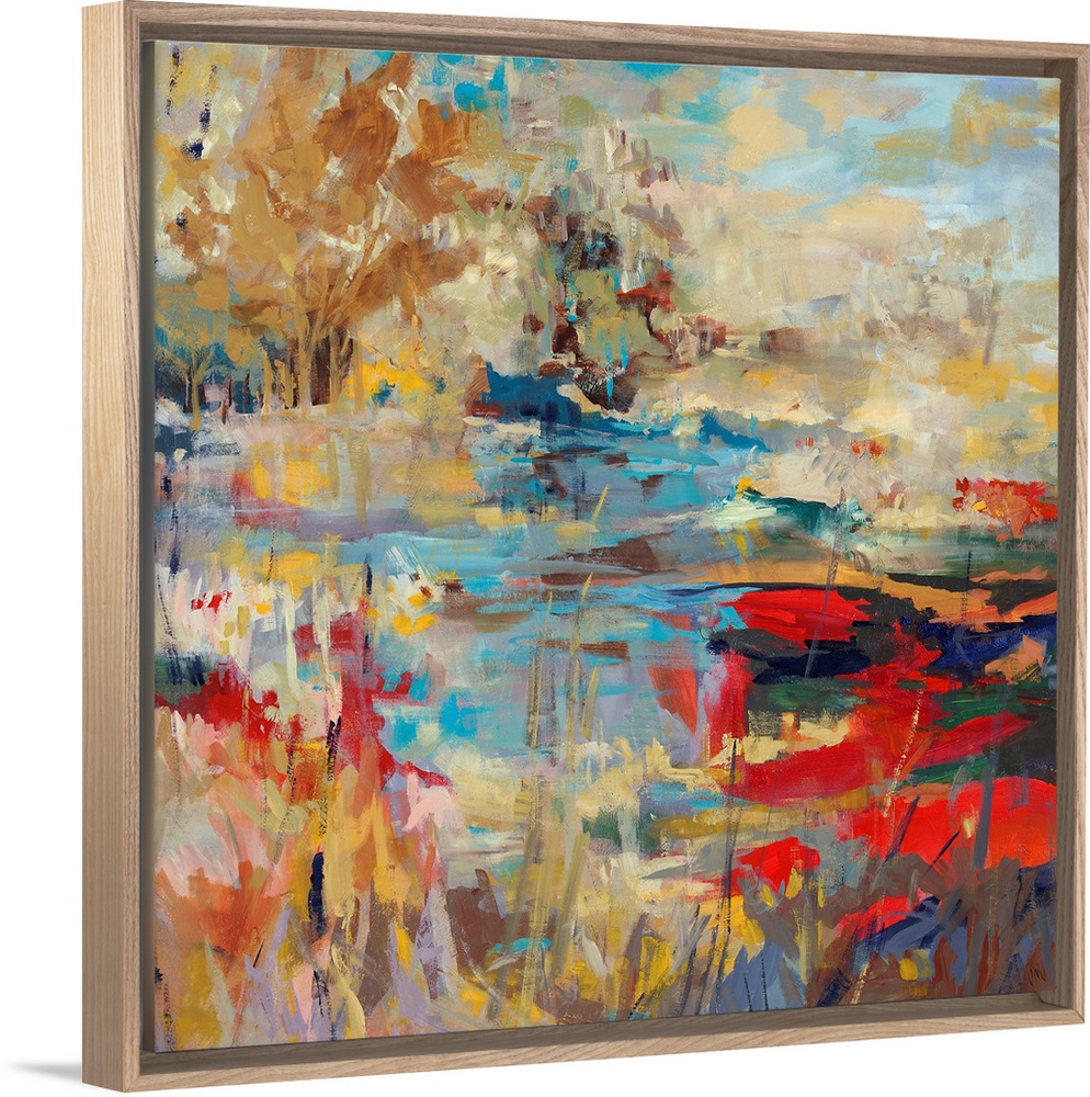 <p>Abstract landscape painting of a creek with hints of poppy red and bright, mustard yellows.</p>