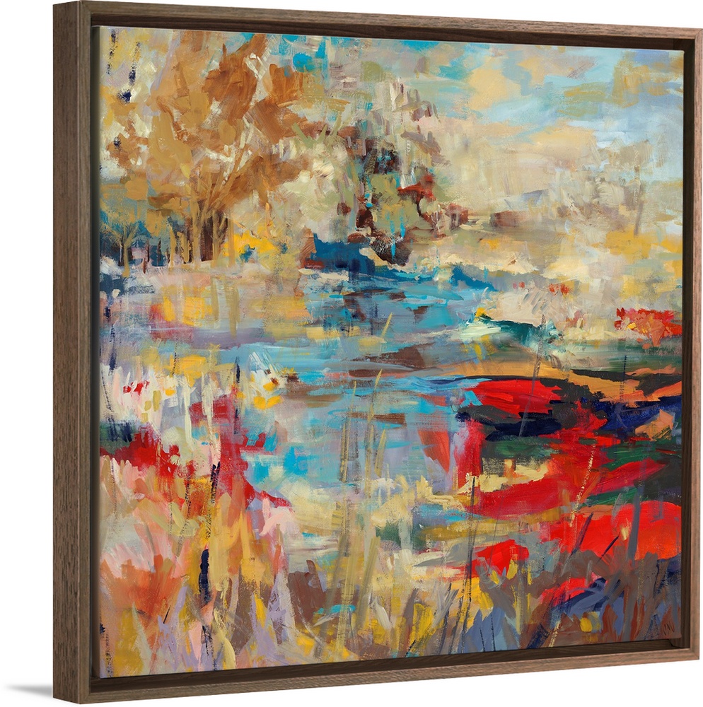 <p>Abstract landscape painting of a creek with hints of poppy red and bright, mustard yellows.</p>